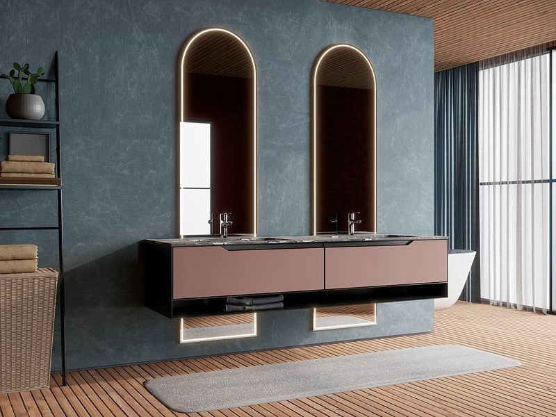 Esta penteadeira de banheiro é apresentada como um sistema guiado por design, em vez de um SKU genérico. Utiliza uma paleta de acabamentos controlada, juntamente com uma estrutura de gabinete premium em aço inoxidável, para criar uma identidade visual mais resolvida para projetos residenciais premium.
