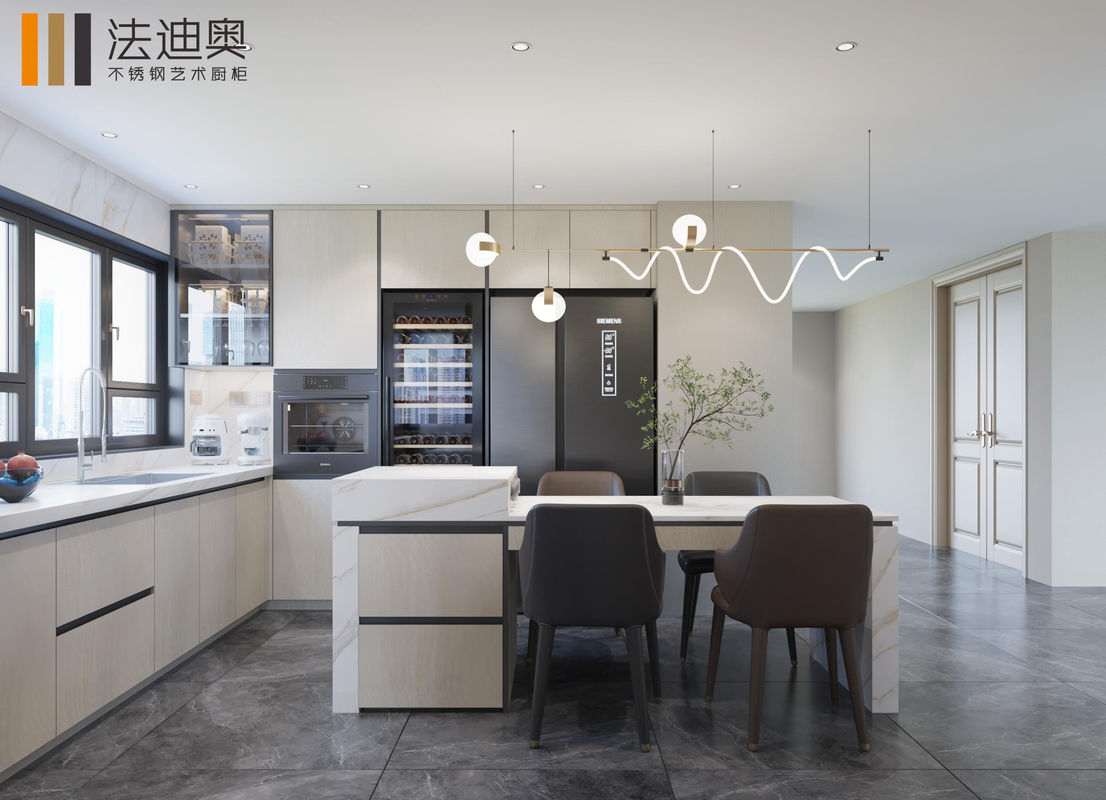 Este armário de cozinha personalizado é construído em torno de uma estratégia de acabamento diferenciada: Grão de madeira emparelhado com estrutura de armário de aço inoxidável.Essa combinação dá aos compradores uma expressão de luxo mais quente sem perder a limpeza e a durabilidade do projeto esperados dos armários de aço inoxidável.