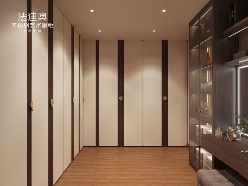 Este guarda-roupa personalizado é construído em torno de uma estratégia de acabamento diferenciada: Beige emparelhado com estrutura de gabinete de aço inoxidável.Essa combinação dá aos compradores uma expressão de luxo mais quente sem perder a limpeza e a durabilidade do projeto esperados dos armários de aço inoxidável.