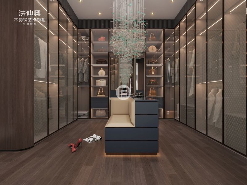 Este guarda-roupa personalizado é construído em torno de uma estratégia de acabamento diferenciada: Madeira / Azul combinada com estrutura de armário em aço inoxidável. Essa combinação confere aos compradores uma expressão de luxo mais calorosa, sem perder a facilidade de limpeza e a durabilidade do projeto esperadas de armários de aço inoxidável.