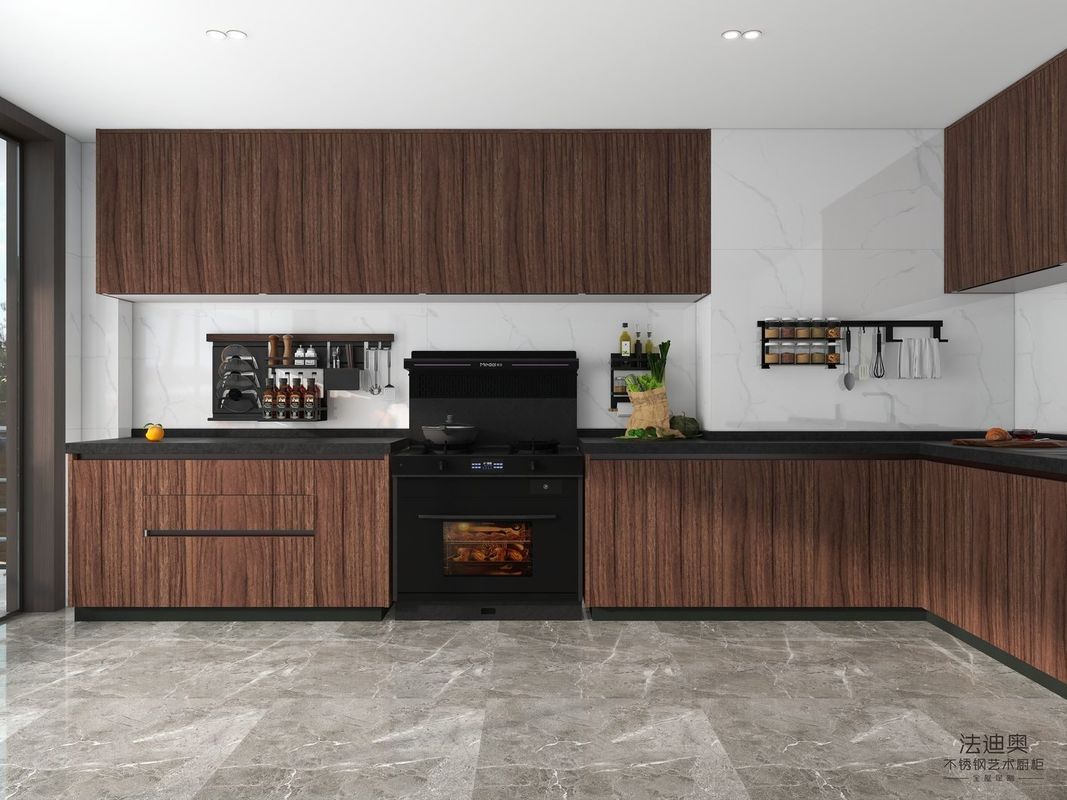 Este armário de cozinha personalizado é construído em torno de uma estratégia de acabamento diferenciada: Madeira / Preto combinado com estrutura de armário em aço inoxidável. Essa combinação oferece aos compradores uma expressão de luxo mais calorosa, sem perder a facilidade de limpeza e a durabilidade do projeto esperadas de armários de aço inoxidável.