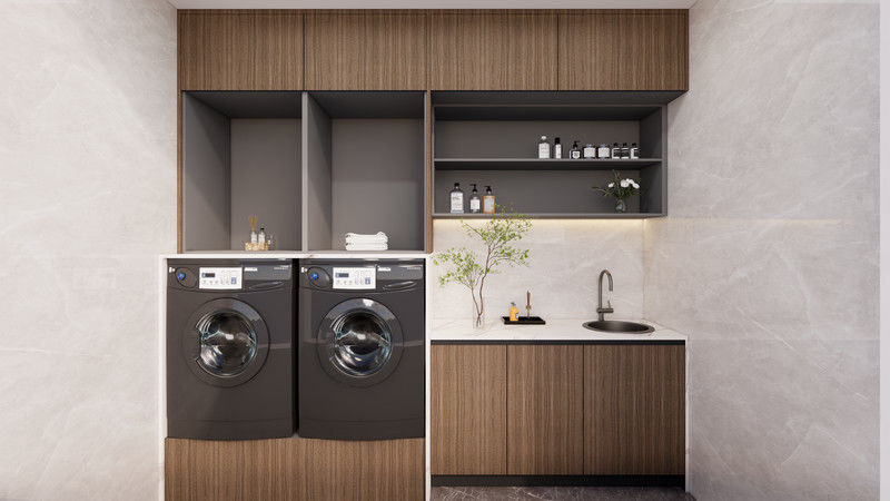 | Projeto | Casa de máquina de lavar integrada com espaço de armazenamento adicional para uma varanda livre de confusão. |