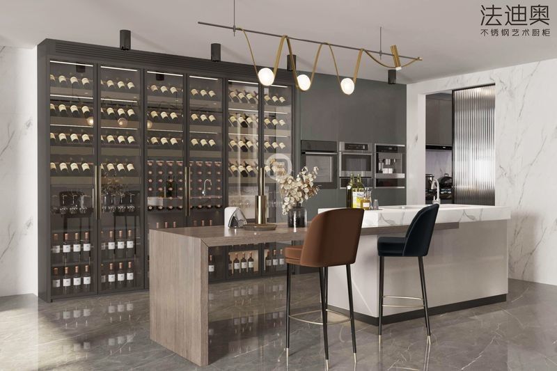 | Layout do Design | Armário de vinhos do chão ao teto com integração de eletrodomésticos embutidos e uma ilha estendida para assentos e armazenamento. |