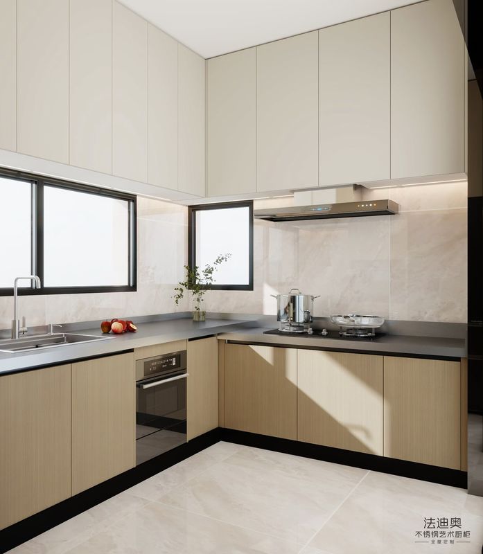 Este armário de cozinha personalizado é construído em torno de uma estratégia de acabamento diferenciada: Grão de madeira emparelhado com estrutura de armário de aço inoxidável.Essa combinação dá aos compradores uma expressão de luxo mais quente sem perder a limpeza e a durabilidade do projeto esperados dos armários de aço inoxidável.