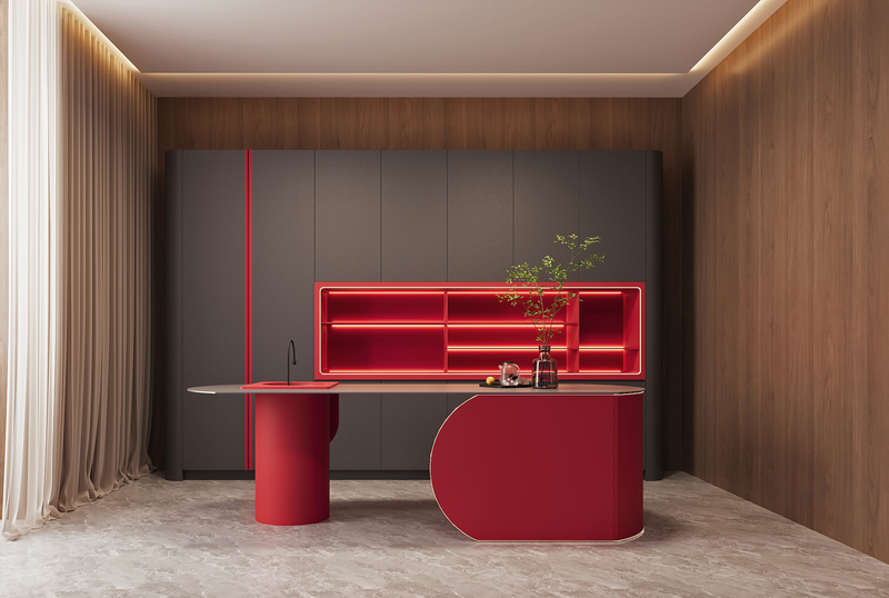 Armário de cozinha em aço inoxidável com design linear e detalhes em preto e vermelho