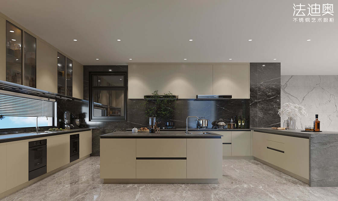 Este armário de cozinha é apresentado como um sistema orientado pelo design em vez de um SKU genérico.Ele usa uma paleta de acabamento controlada juntamente com a estrutura do gabinete de aço inoxidável para criar uma identidade visual mais resolvida para projetos residenciais premium.