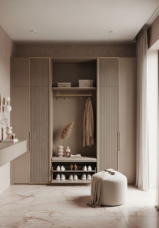 | Destaques do DesignMinimalismo feminino suave com detalhe de canelura arquitetônica, paleta tonal quente, superfícies sem brilho com predominância de taupe cogumelo quente, fundo compatível com cortinas em champanhe pálido, micro-acessórios em dourado champanhe, proporções disciplinadas e portas verticais de laca taupe micro-canelada em passo de 15mm, criando um ritmo sutil de sombras. A página deve ser lida como uma especificação resolvida, não uma caixa de armazenamento genérica. |