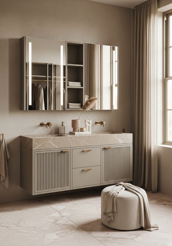 | Utilização | Armazenamento de banheiros para espaços residenciais de luxo, hospitalidade boutique e spa inspirados em espaços de bem-estar que buscam calor tonal com durabilidade premium |