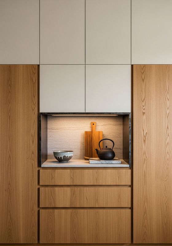 | Estilo de Design | Minimalismo Japandi com tons sutis de wabi-sabi — linhas limpas suavizadas pelo calor do material, padrões de grão visíveis e detalhes de metalurgia artesanal |
