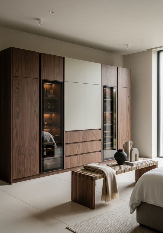 | Cor | Castanho nogueira escuro (médio-escuro quente com subtil tom avermelhado) como superfície primária; taupe cashmere (neutro quente entre areia e cogumelo) para módulos de destaque; bronze fumê (escuro metálico quente) para tonalidade do vidro e ferragens; greige quente (tom de gesso, ligeiramente rosado-quente) como neutro secundário para superfícies de apresentação interior |
