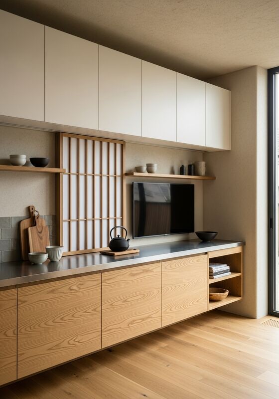 | Destaques do DesignMinimalismo Japandi contido com o calor de materiais wabi-sabi — predominância de carvalho de grão reto, elementos recessivos branco-off em tons quentes, finos detalhes estruturais escuros, integração de iluminação suave e difusa com direção em carvalho japonês natural (primário), branco marfim quente (superfícies secundárias), ferro preto (detalhe estrutural), cinza argila quente (prateleira acessória opcional em cerâmica), proporções disciplinadas e folheado de carvalho japonês natural sobre núcleo estrutural de aço inoxidável 304. A página deve ser lida como uma especificação resolvida, não uma caixa de armazenamento genérica. |